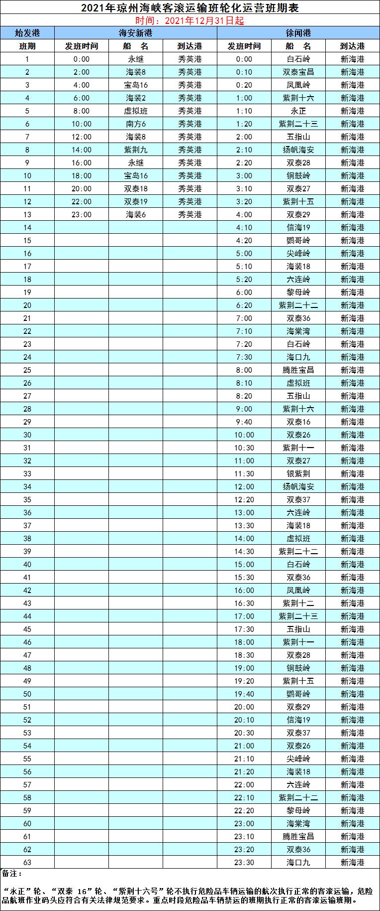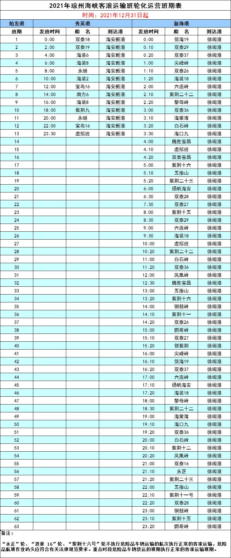 自2021年12月31日零时起,新海港出岛航次将调整至每日63个、秀英港出岛航次调整至每日13个;徐闻港进岛航次将调整至每日63个、海安新港进岛航次调整至每日13个。