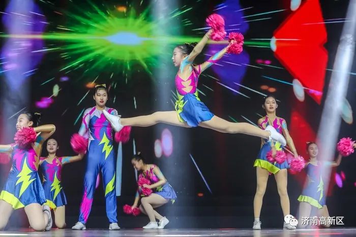 通过开展丰富多彩的体育活动,强健学生体魄。2020年全市学生体质健康测试抽查复核情况, 济南高新区学生体质健康水平同时创下4个全市第一,即总平均分排名第一、 合格率排名全市第一、优良率排名全市第一、优秀率排名全市第一。今年全市中小学学生跳绳比赛中,高新区黄金谷学校斩获一等奖;高新区奥体中路学校初中部健美操队卫冕成功,连续四年在全市校园啦啦操比赛中夺冠……在本次展演中,在济南市健美操和啦啦操比赛中获特等奖的高新区中小学队伍,带来激情向上的健美操表演《青春飞扬》,展现了高新区学生良好的身体素质和精神风貌。