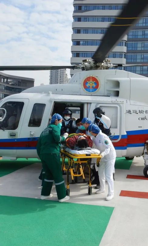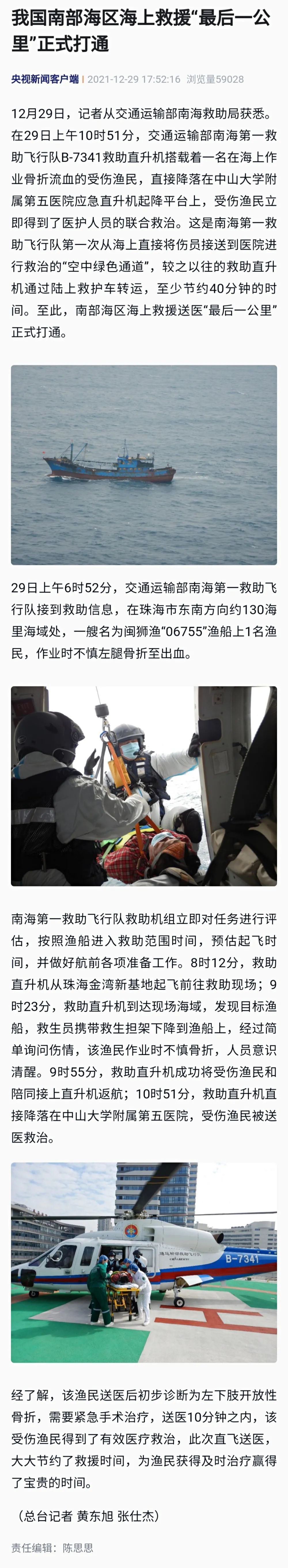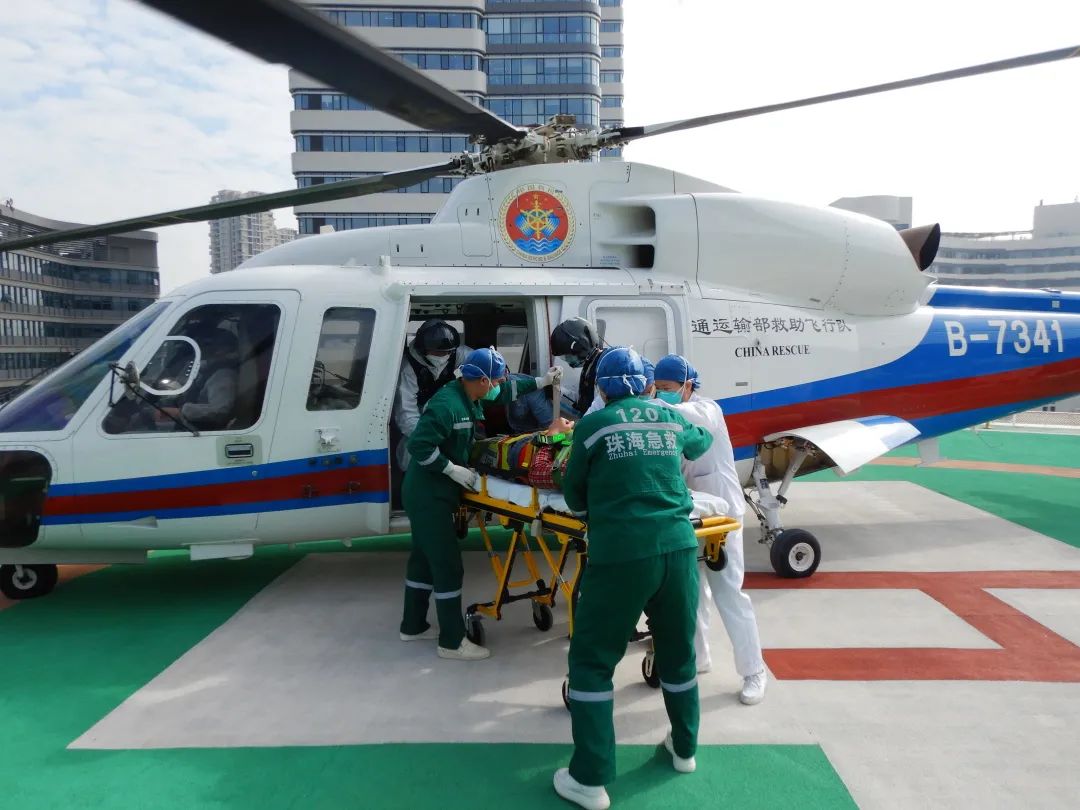 2021年12月29日10时51分,交通运输部南海第一救助飞行队B-7341救助直升机搭载着一名在海上作业骨折流血的受伤渔民,直接降落在中山大学附属第五医院应急直升机起降平台上,受伤渔民立即得到了医护人员的联合救治。这是南海第一救助飞行队第一次从海上直接将伤员接送到医院进行救治的“空中绿色通道”,较之以往的救助直升机通过陆上救护车转运,至少节约40分钟的时间。至此,南部海区海上救援送医“最后一公里”正式打通。