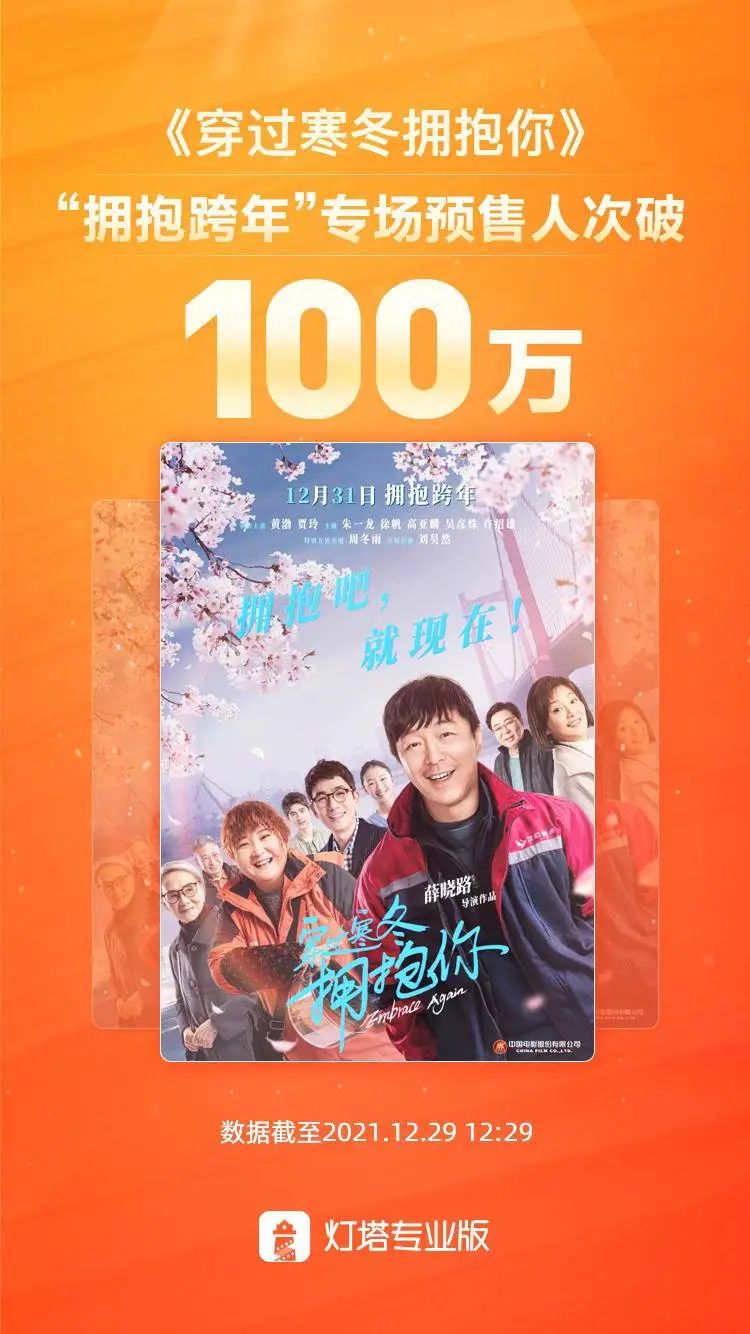 据灯塔专业版数据显示,截至12月29日12时,头部影片《穿过寒冬拥抱你》“拥抱跨年”观影专场购票总人次突破100万(影片在该场次1月1日0时1分后有字幕彩蛋),跨年场的预售票房已达4415万,领跑档期新片。《反贪风暴5:最终章》《以年为单位的恋爱》的预售票房则排在第二、三位。