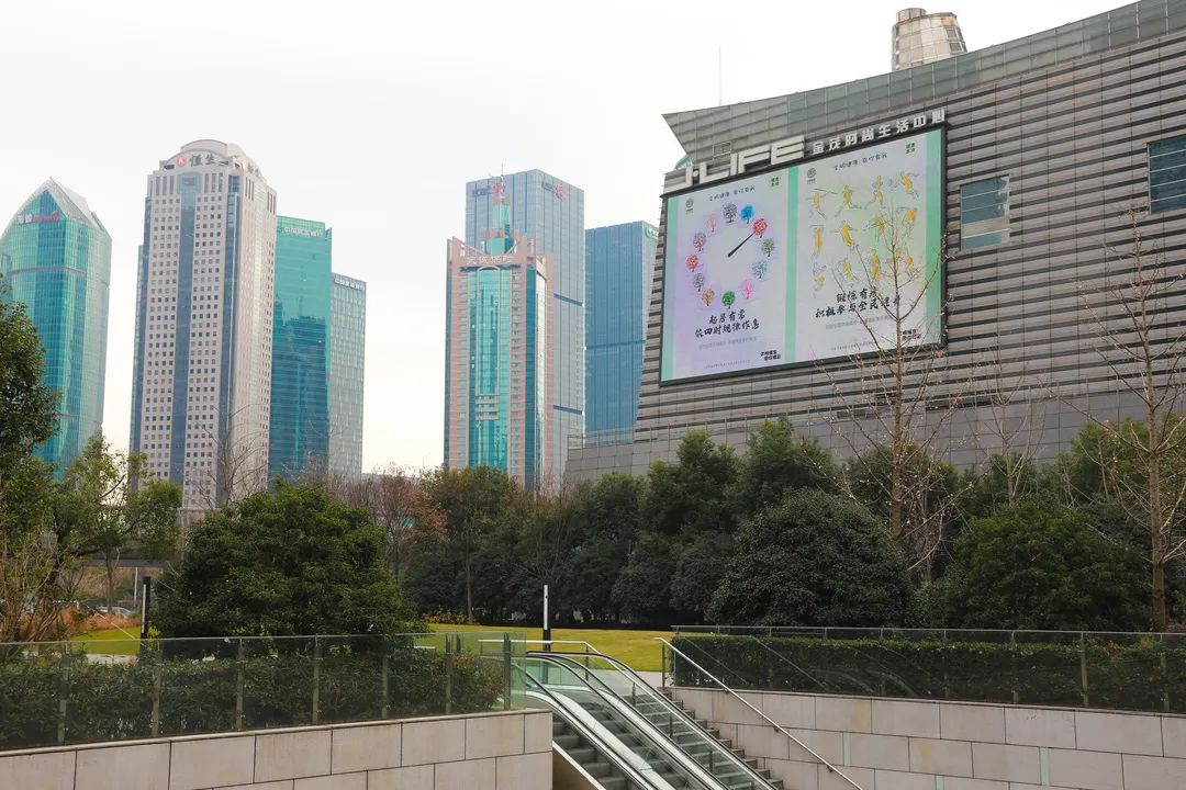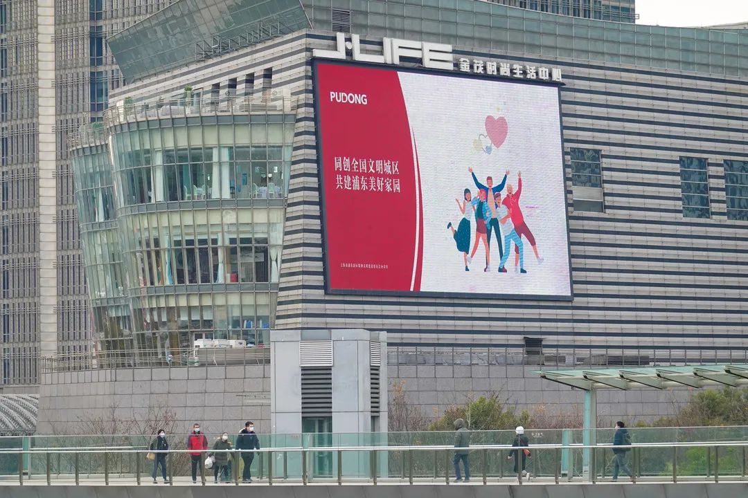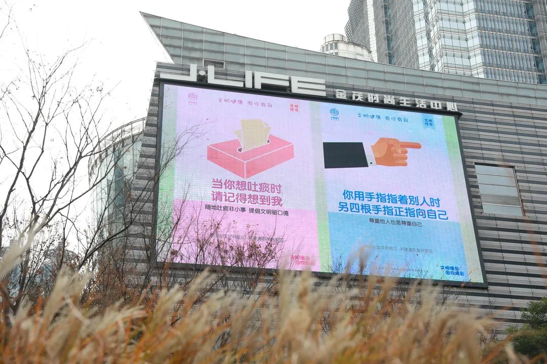 在高楼林立的小陆家嘴核心区,文明创城的相关宣传元素可谓随处可见,而最醒目的莫过于金茂时尚生活中心外墙液晶大屏中滚动播出的公益广告。这块屏幕足有3层楼高,正在循环播出不同的公益广告。“共创全国文明城区,共建浦东美好家园”点明创城主题,“垃圾分一分,环境美十分”“一起动手参与,清洁我们的家园”宣传绿色生活,“放松身心才能继续前行”“哪怕压力如山,我自轻松常在”倡导心理健康……