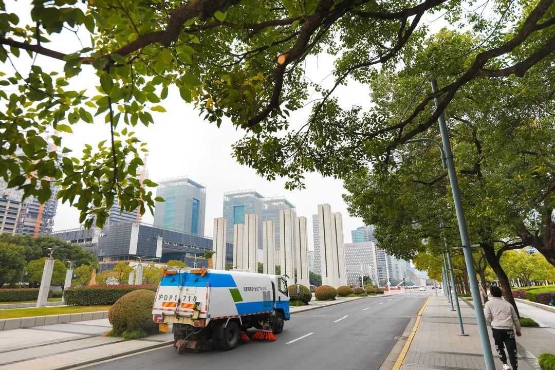 在新区办公中心周边区域,路边灯柱上悬挂的文明宣传道旗红白相间非常吸引眼球,与路边绿化带中的绿树红花相互交融。宽敞整洁的路面上,一辆扫地车缓缓驶过,将落叶与灰尘纳入“腹中”,留给市民更加干净的生活环境。