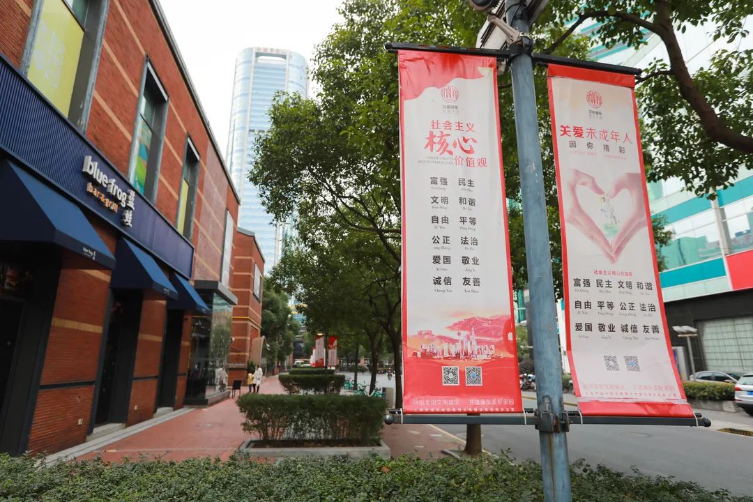 沿着世纪大道一路向东,文明创城的宣传氛围丝毫不减,市民群众文明有序的生活方式也令人舒适。在96广场商圈,路边灯柱上整齐悬挂着“文明浦东,因你精彩”、社会主义核心价值观、关爱未成年人等内容的道旗。这里是餐饮行业的聚集地,每到餐点会聚集大量外卖员,但依靠自律与监督,停车、交通秩序井然有序。
