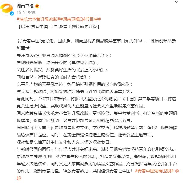 根据证券时报此前报道,10月9日晚8:20,湖南卫视原本应该播出《快乐大本营》国庆特别节目“我在他乡挺好的”,但在湖南卫视官方网站的“收视指南”中并没有发现《快乐大本营》的播出计划,节目单上,这个时段变成了播出电视剧《好好生活》。