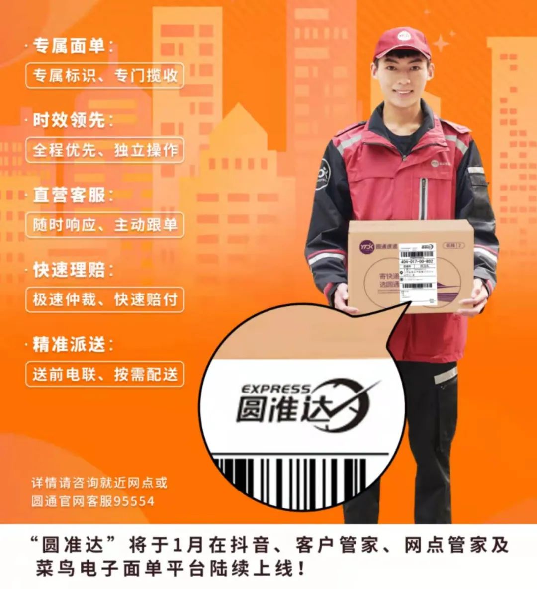 “圆准达”将于2022年1月在抖音、客户管家(圆通客户专用app)、网点管家(圆通分公司专用app)及菜鸟电子面单平台等渠道上线。