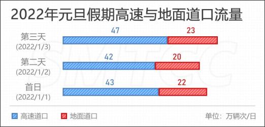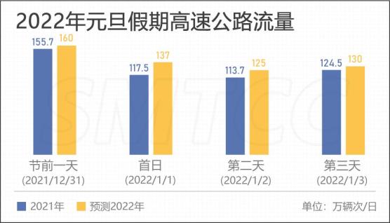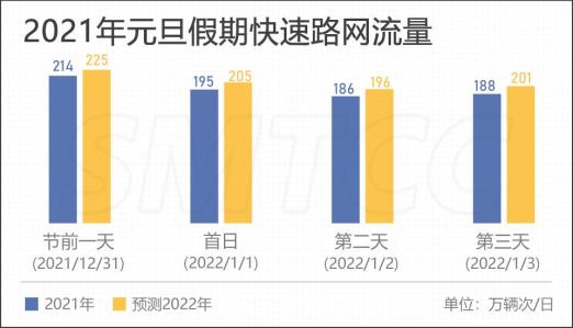 预计2022年元旦假期路网总体流量达603万辆次,日均流量约201万辆次,同比上升3.1%,与节前双休日流量相比上升5个百分点。