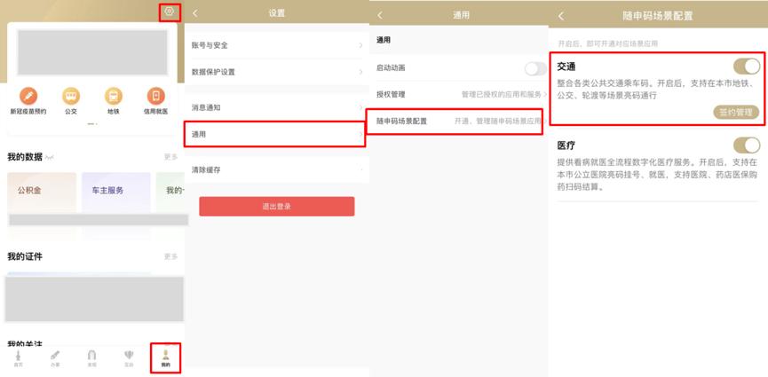 在“随申办”移动端首页下方点击 “我的”频道- “设置” -“通用” -“随申码场景配置”,在交通中“开启交通场景”-“签约支付渠道”