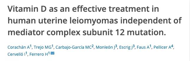 Corachán A, Trejo MG, Carbajo-García MC, Monleón J, Escrig J, Faus A, Pellicer A, Cervelló I, Ferrero H. Vitamin D as an effective treatment in human uterine leiomyomas independent of mediator complex subunit 12 mutation. Fertil Steril. 2021 Feb;115(2):512-521. doi: 10.1016/j.fertnstert.2020.07.049. Epub 2020 Oct 7. PMID: 33036796.