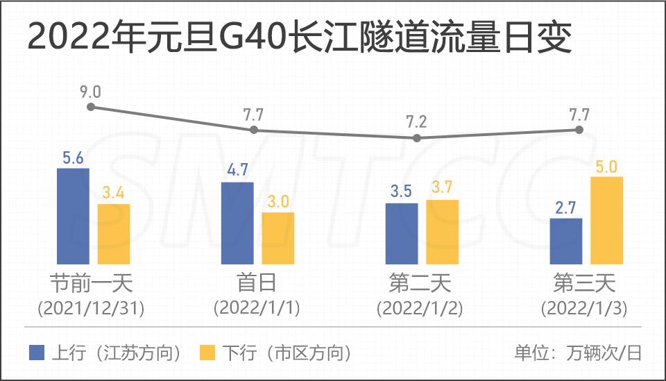 预计元旦期间长江隧道日均流量约7.5万辆次,同比增长10.3%。长江隧道流量方向性较为明显,假期前一天及首日长江隧道流量以上行(江苏方向)为主,其中节前一天高峰出现在下午15至20时,首日出行高峰出现在9时至12时,高峰小时流量达约5100辆次。节日最后一天长江隧道流量以下行(市区方向)为主,高峰出现在下午14至18时,高峰小时流量达约5500辆次。