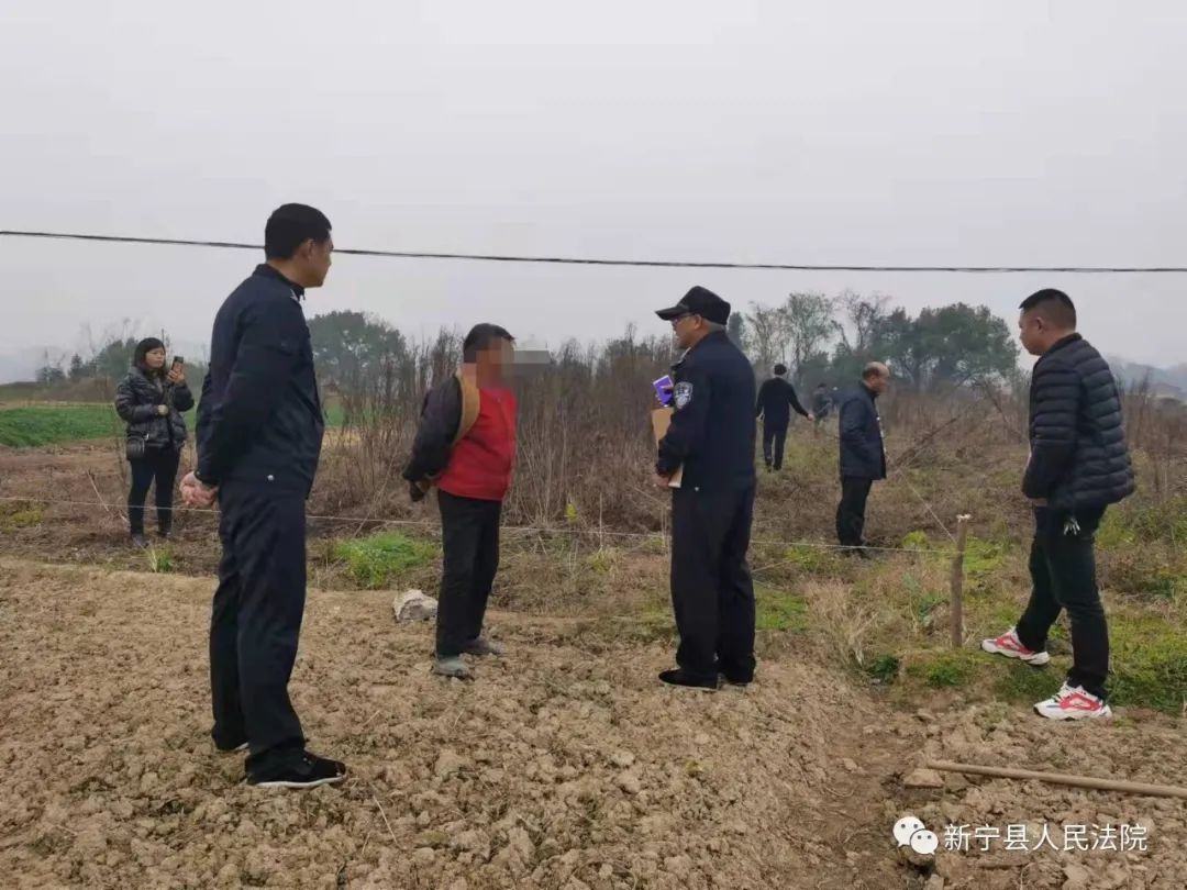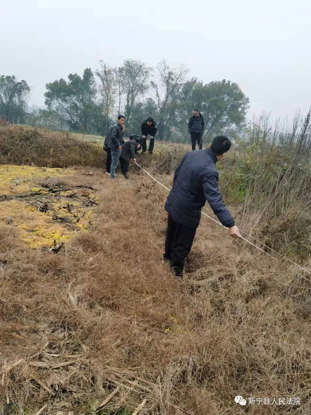 根据该案情况,新宁县人民法院执行局局长康红文与执行干警们研究制定了周密的执行方案。2021年12月24日上午,在康红文的带领下,该院共出动警车3辆,执行干警13人,同时邀请人大代表、驻村干部、村干部以及部分群众现场监督执行过程。到达现场后,各组人员有条不紊地开展工作,执行干警按判决书确定的位置丈量责任田面积、打桩确定位置,该案于当天执行完毕。