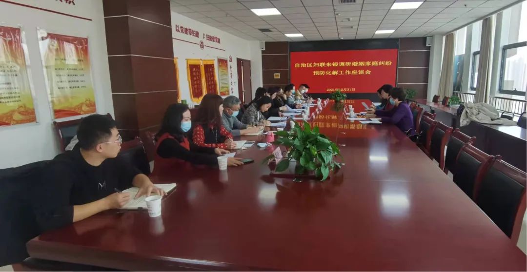 为进一步推进平安宁夏建设,积极主动化解婚姻家庭矛盾纠纷,寻找破题的新角度,探索工作的新路径,自治区妇联副主席马英、权益部部长周文盈、副调研员赵金霞于12月31日在银川市召开了婚姻家庭纠纷预防化解工作座谈会。