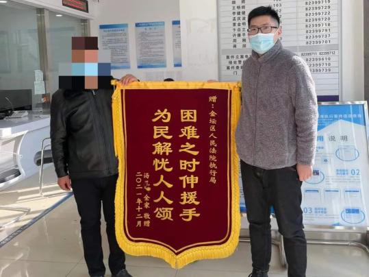 2021年12月29日,一起交通事故责任纠纷案件的申请执行人汤某向金坛法院执行局送来了一面锦旗,大赞金坛法院执行局“困难之时伸援手,为民解忧人人颂”。