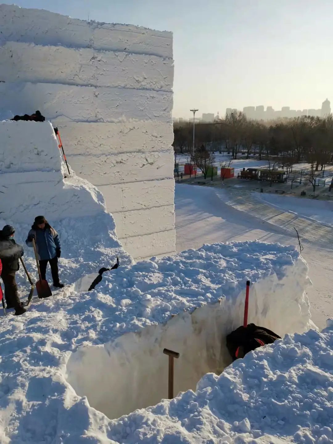 雪坯有大小不一,完全依照设计的雪雕体量大小来堆砌。