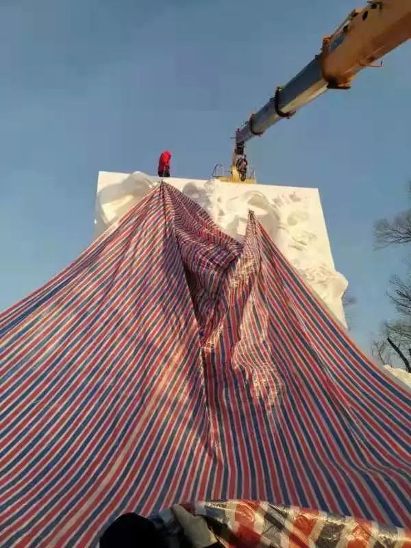 值得注意的是,雪雕制作过程中,哈尔滨的气温并不是那么“听话”,忽高忽低。就像今年竞然在11月下起雨。为了防止雪雕风化。每天收工后,制雪队伍都要给雪雕半成品进行苫盖,这是很少有人知晓的“秘密”。