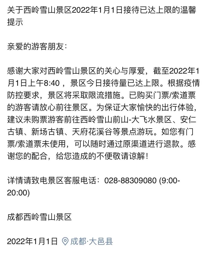 成都西岭雪山景区今(2022年1月1日)早发布《关于西岭雪山景区2022年1月1日接待已达上限的温馨提示》: