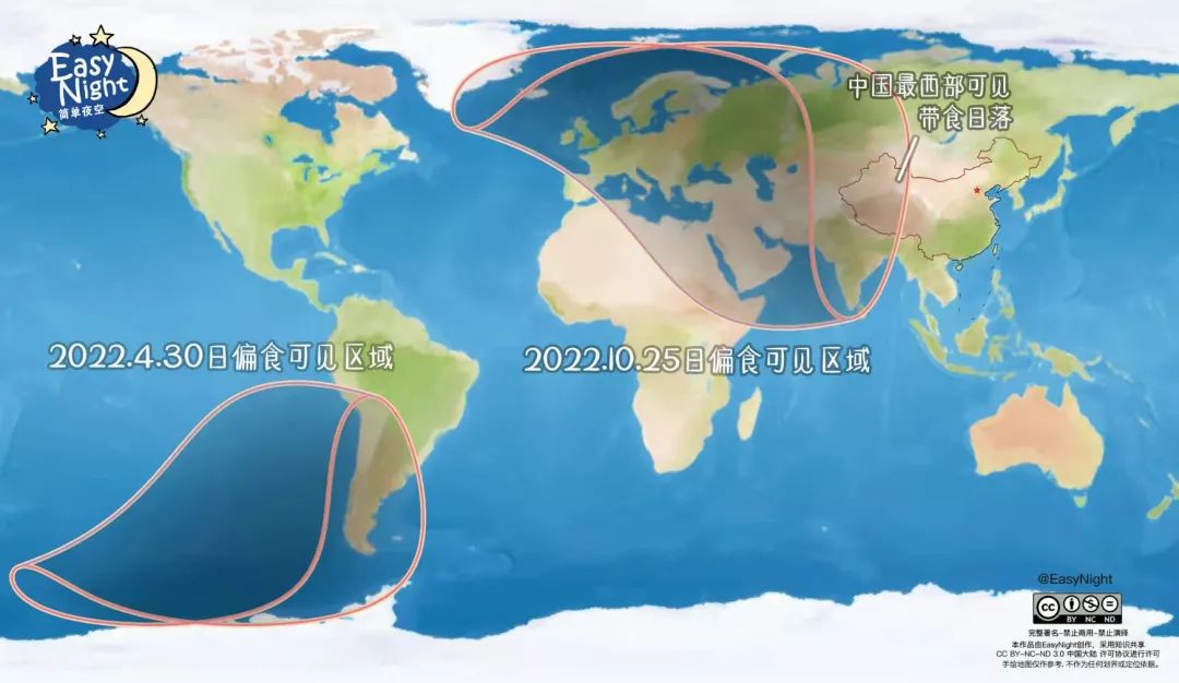 第二场是10月25日,发生在欧洲到西亚、中亚地区,月影扫到中国新疆最西部的时候,已经快要落幕了。在国内,只能到新疆最西部去,才能看到一半的带食日落。