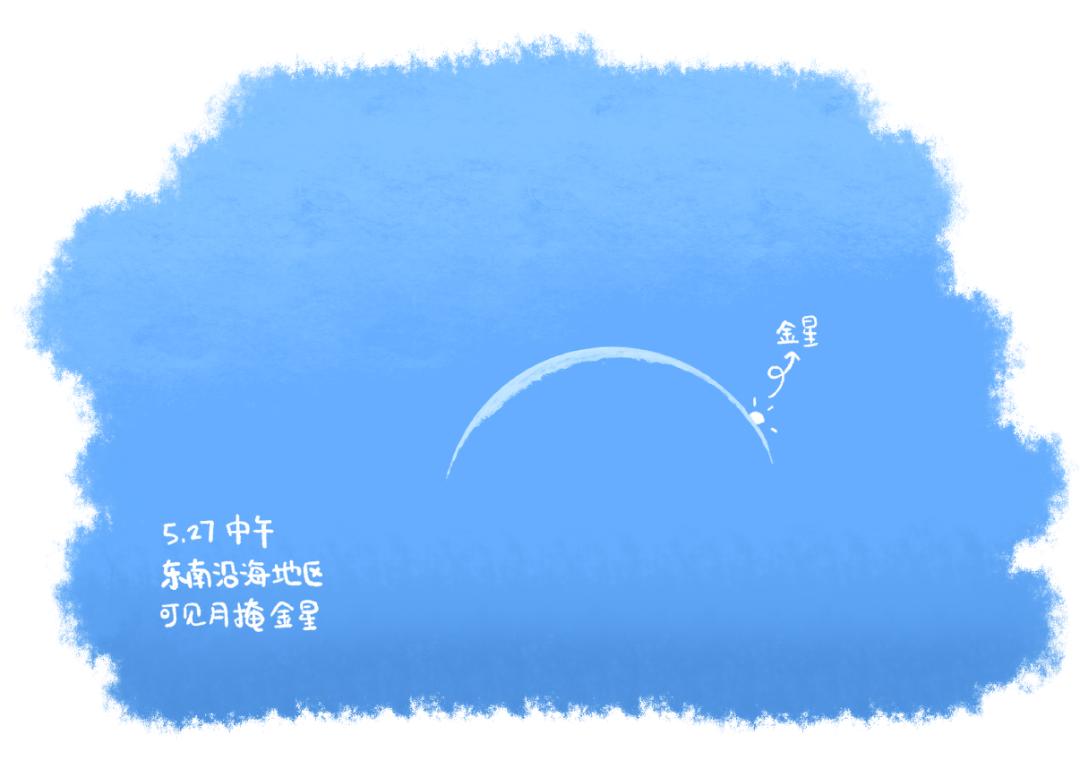 5月27日中午,月亮会在白天掩食金星,中国东南沿海地区可见。由于金星的平均面亮度比月亮更高,而它俩又都比蓝天背景的天光更亮,所以用望远镜或长焦镜头就可以在白天欣赏到这场月掩金星(注意别直视到太阳!)。