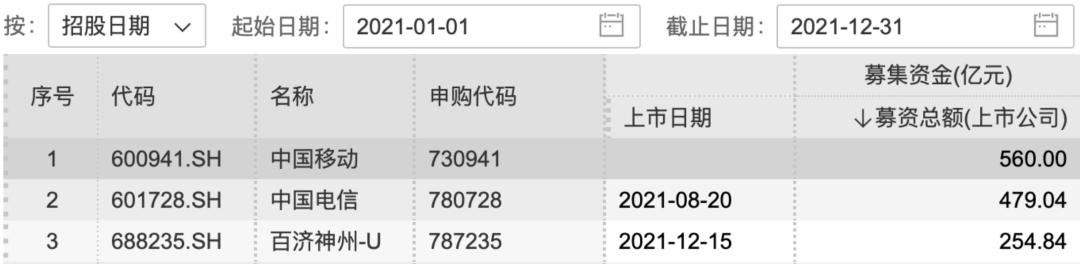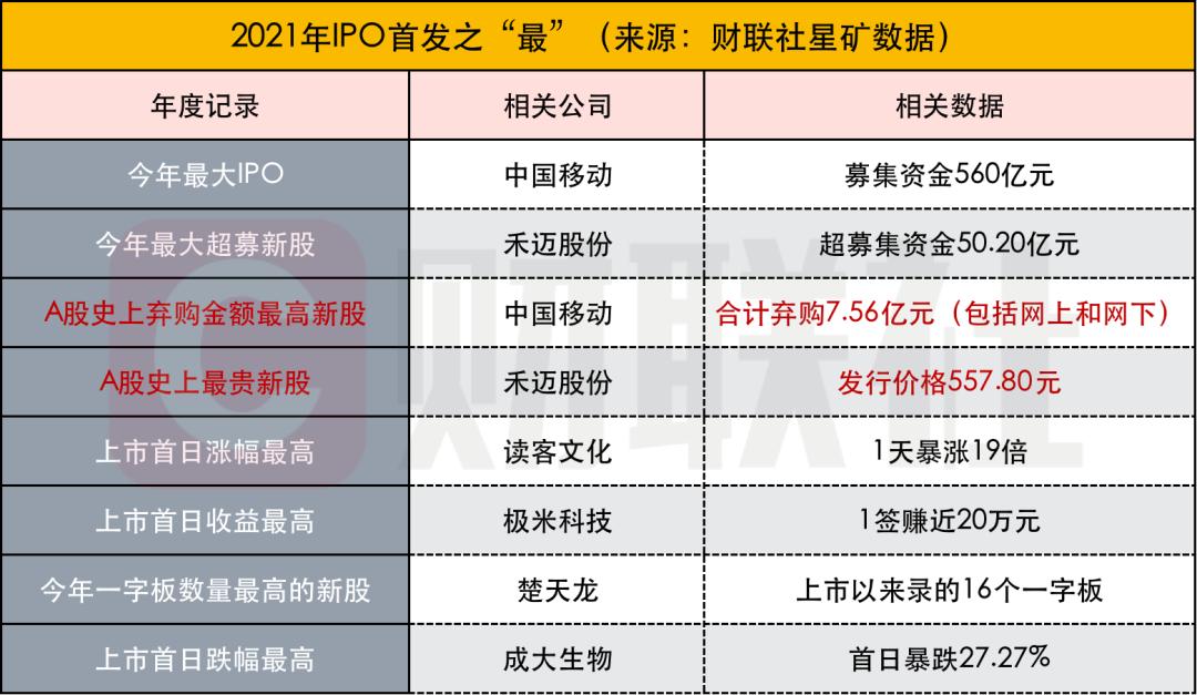 这一年,A股IPO亮点纷呈:“电信三巨头”中国移动和中国电信回归A股接连刷新2021年IPO首发规模、中国移动合计弃购金额7.56亿元创历史纪录、新股禾迈股份发行价直冲557.8元创历史记录。