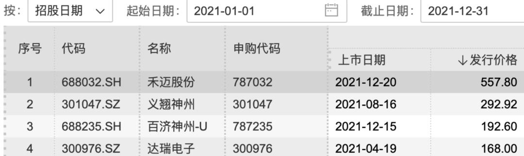 2021年打新市场高价股频频出现,根据星矿数据显示,A股历史上新股发行价居前的100名个股中,2021年发行的个股占据了30%。其中,最贵的要数2021年末发行的禾迈股份,发行价格557.8元,远超第二名义翘神州的292.92元。