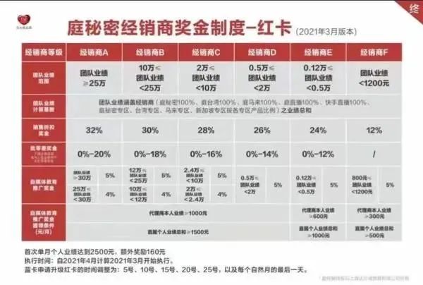 以“红卡”为例,“红卡”代理分为7个等级,各级别拿货价格相同,但不同级别的返利不同,因此团队业绩越高,返利越多。