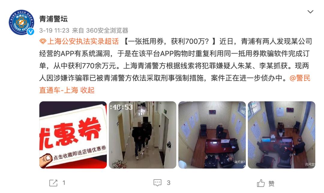 3月,张女士又看到一则新闻。两名代理商利用TST商城APP抵用券漏洞,薅羊毛获利770万元,二人听从上级指示来上海配合调查,后因涉诈骗罪被上海青浦警方依法采取刑事强制措施。