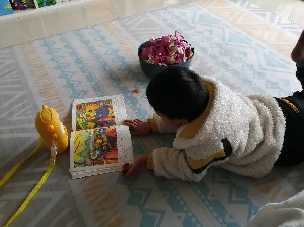 和我一起坐在地垫上看书,我不小心踢着沙发腿了,圆圆听见了,立马问我:是不是很痛?我说不痛,他坚持要看看我的脚,还朝我的脚吹吹气,安慰我说:一会儿就不痛了……