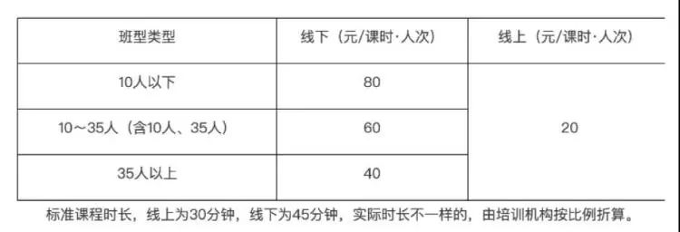 具体到线下标准课程时长培训的收费标准,35人以上为40元/课时·人次,10~35人(含10人、35人)为60元/课时·人次,10人以下为80元/课时·人次。线上课程方面,3种班型均为20元/课时·人次。