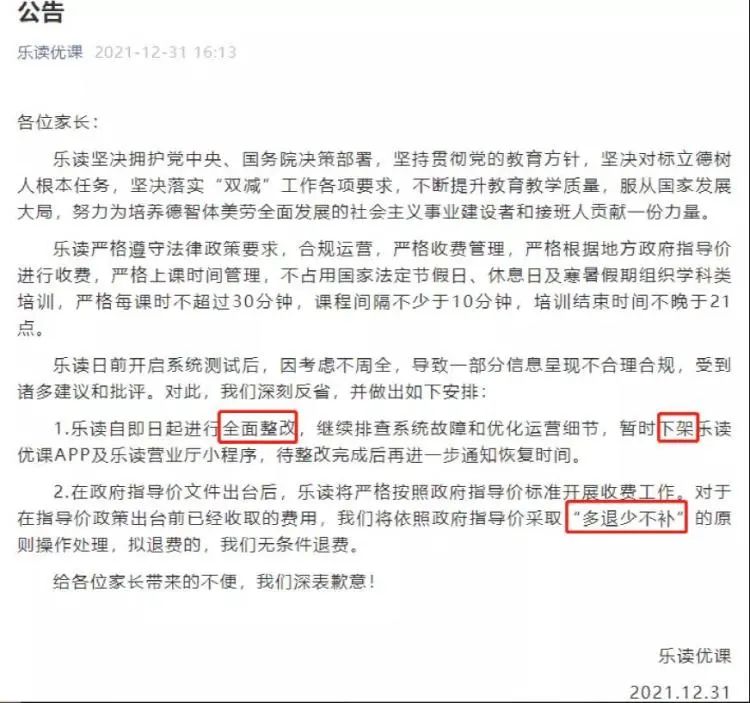 2021年12月31日下午,乐读优课在官方微信发布公告称:自即日起进行全面整改,暂时下架乐读优课APP及乐读营业厅小程序,对于在指导价政策出台前已经收取的费用,将依照“多退少不补”的原则操作处理,拟退费的,无条件退费。