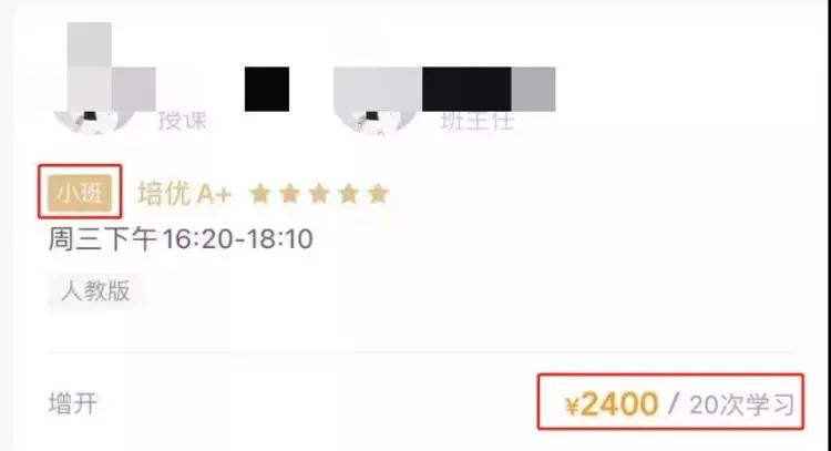 北京的情况也类似,以六年级英语课程为例,该课程分为A、A+、S、S+班四种班型,每周一至周五直播授课。20次课售价从1680元-2400元不等,单次课程3课时共110分钟,其中小班35人,单次课价格为120元;大班100人,单次课价格为84元。换算成单课时,小班价格达到了40元课时·人次,超出政府指导价一倍。