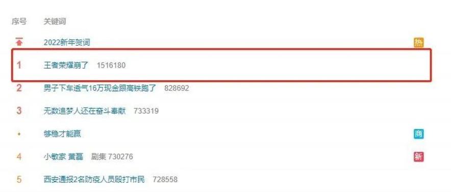 1月1日晚间微博热搜第一来自于王者荣耀。