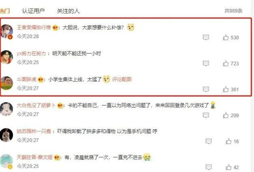 当日晚间,有网友反映,王者荣耀出现登录异常、游戏内好友显示异常等问题。更有网友评论“明天能不能还我一小时。”
