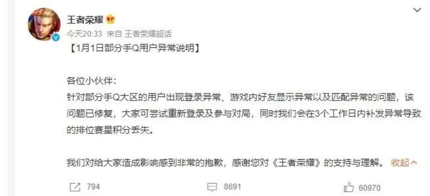 对此,王者荣耀官方发布用户异常说明,说明显示:“针对部分手Q大区的用户出现登录异常、游戏内好友显示异常以及匹配异常的问题,该问题已修复,大家可尝试重新登录及参与对局,同时我们会在3个工作日内补发异常导致的排位赛星积分丢失。”