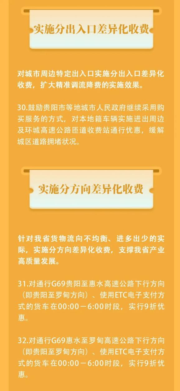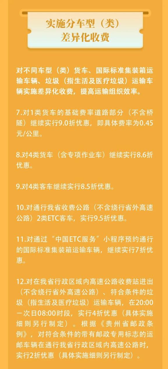 6.对在我省行政区域内高速公路收费站进出(不含绕行省外高速公路)、符合条件的垃圾(指生活及医疗垃圾)运输车辆,在20:00-次日08:00时段,实行4折优惠(具体实施细则另行制定)。根据《贵州省邮政条例》,对符合条件的带有邮政专用标志的运邮车辆在通行我省行政区域内高速公路时,实行2折优惠(具体实施细则另行制定)。