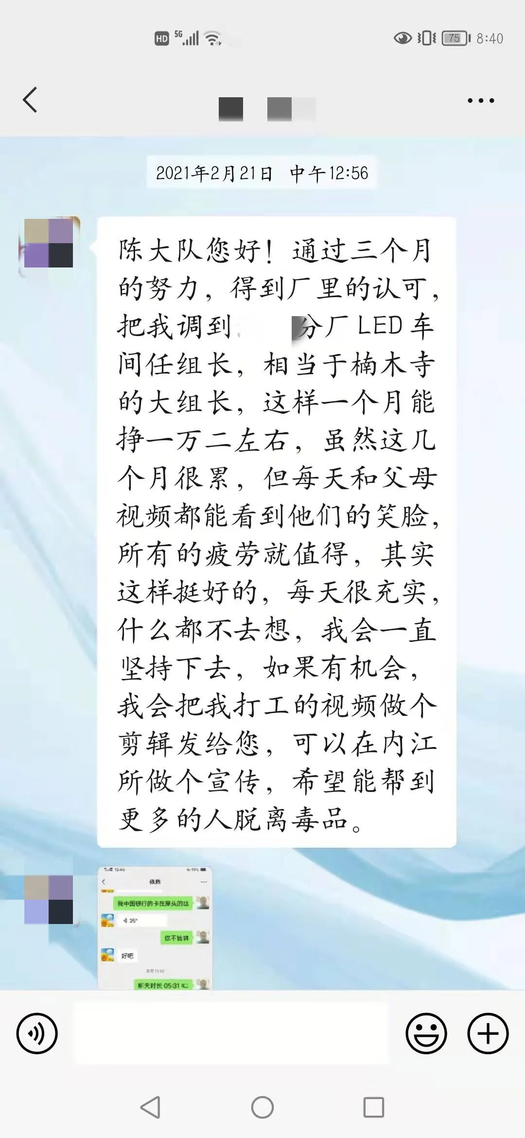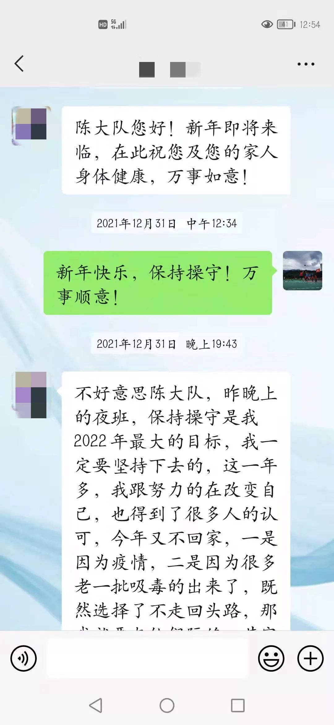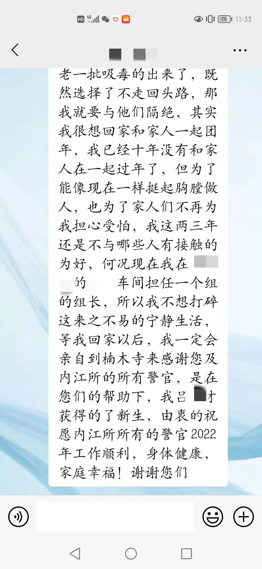不好意思陈大队,昨晚上的夜班。保持操守是我2022年最大的目标,我一定要坚持下去的。这一年多,我更(原文“跟”)努力在改变自己,也得到了很多人的认可。今年又不回家,一是因为疫情,二是因为很多老一批吸毒的出来了,既然选择了不走回头路,那我就要与他们隔绝,其实我很想回家和家人一起团年,我已经十年没有和家人一起过年了,但为了能像现在一样挺起胸膛做人,也为了家人们不再为我担心受怕,我这两三年还是不与那(原文“哪”)些人有接触的为好,何况现在我在某公司的某车间担任一个组的组长,所以我不想打碎这来之不易的宁静生活,等我回家以后,我一定会亲自到楠木寺赖感谢您及内江所的所有警官,是在您们的帮助下,我才获得了新生,由衷的祝愿内江所所有的警官2022年工作顺利,身体健康,家庭幸福!谢谢您们!