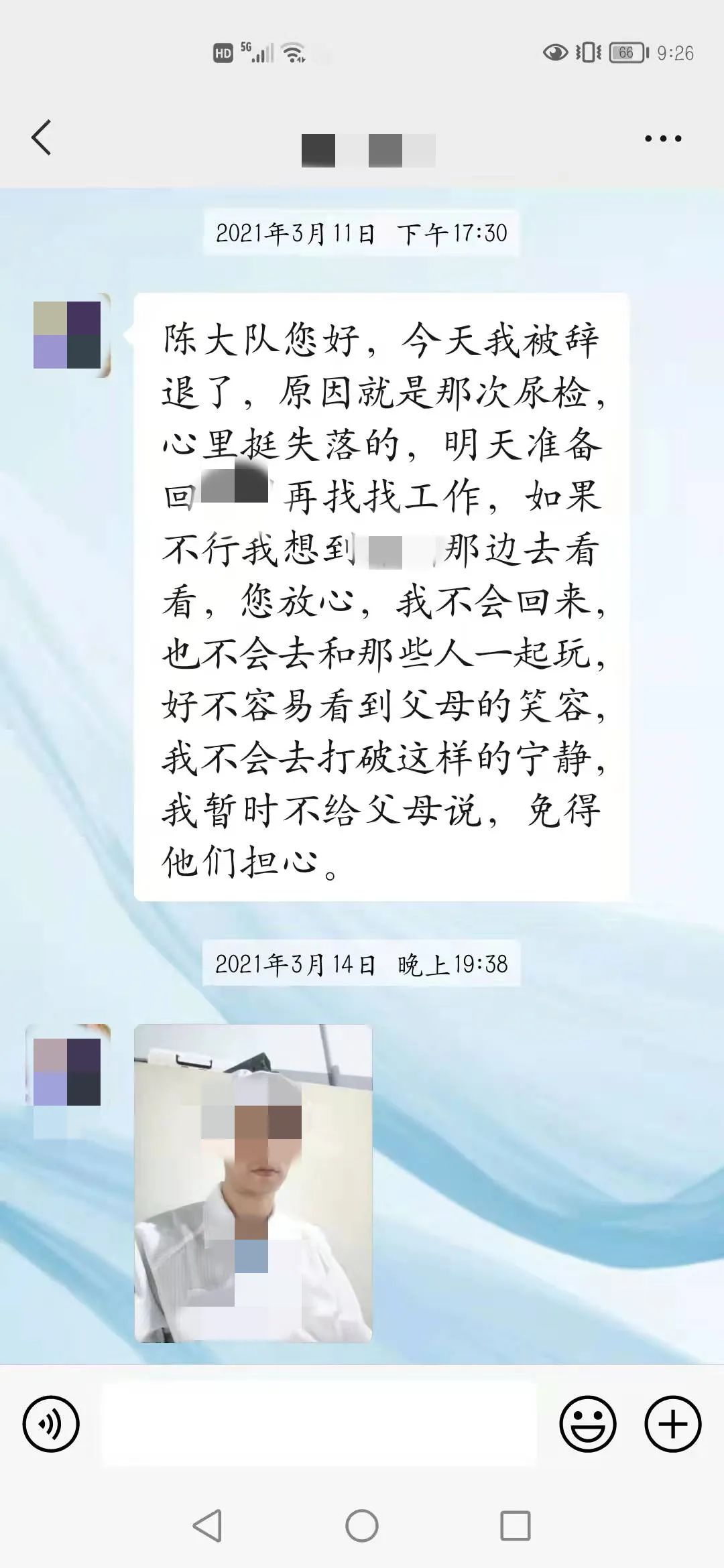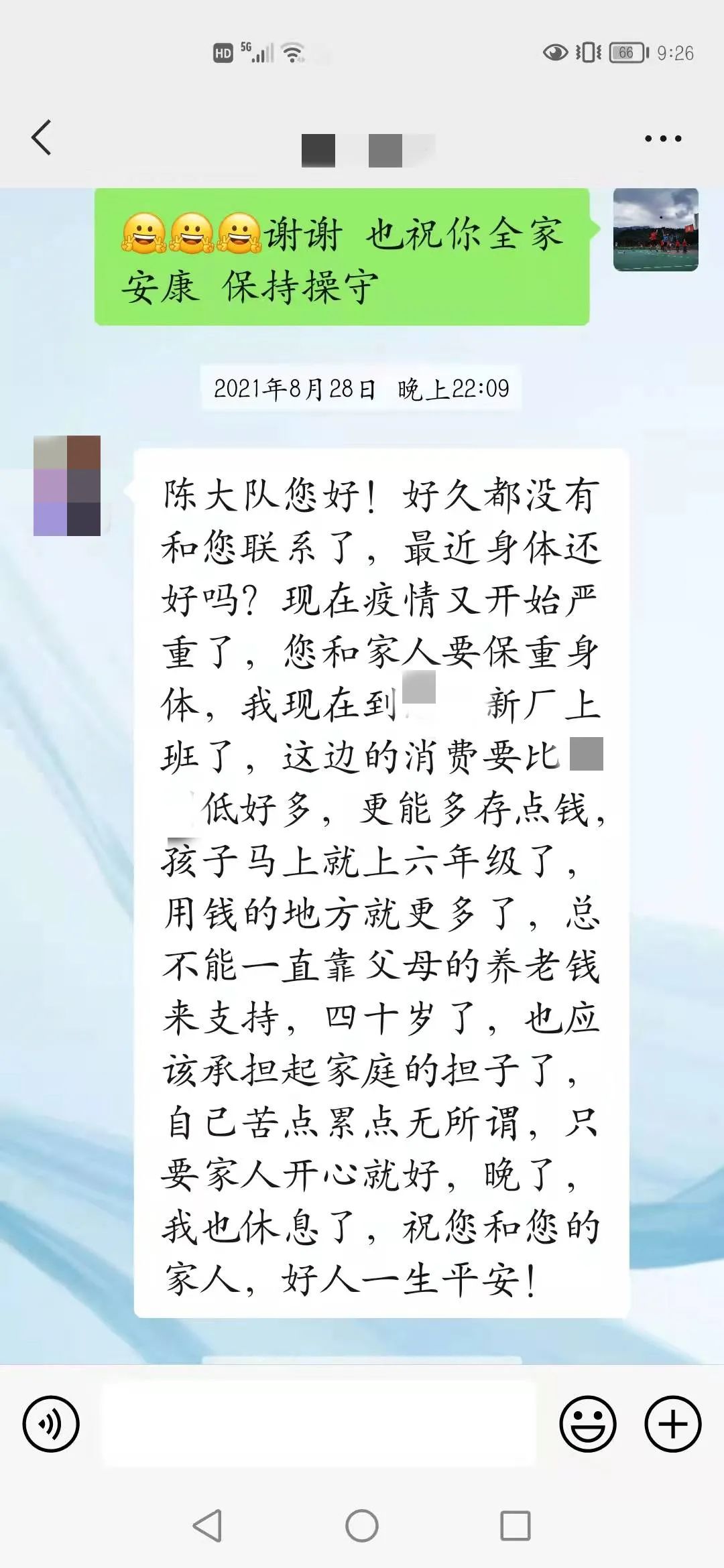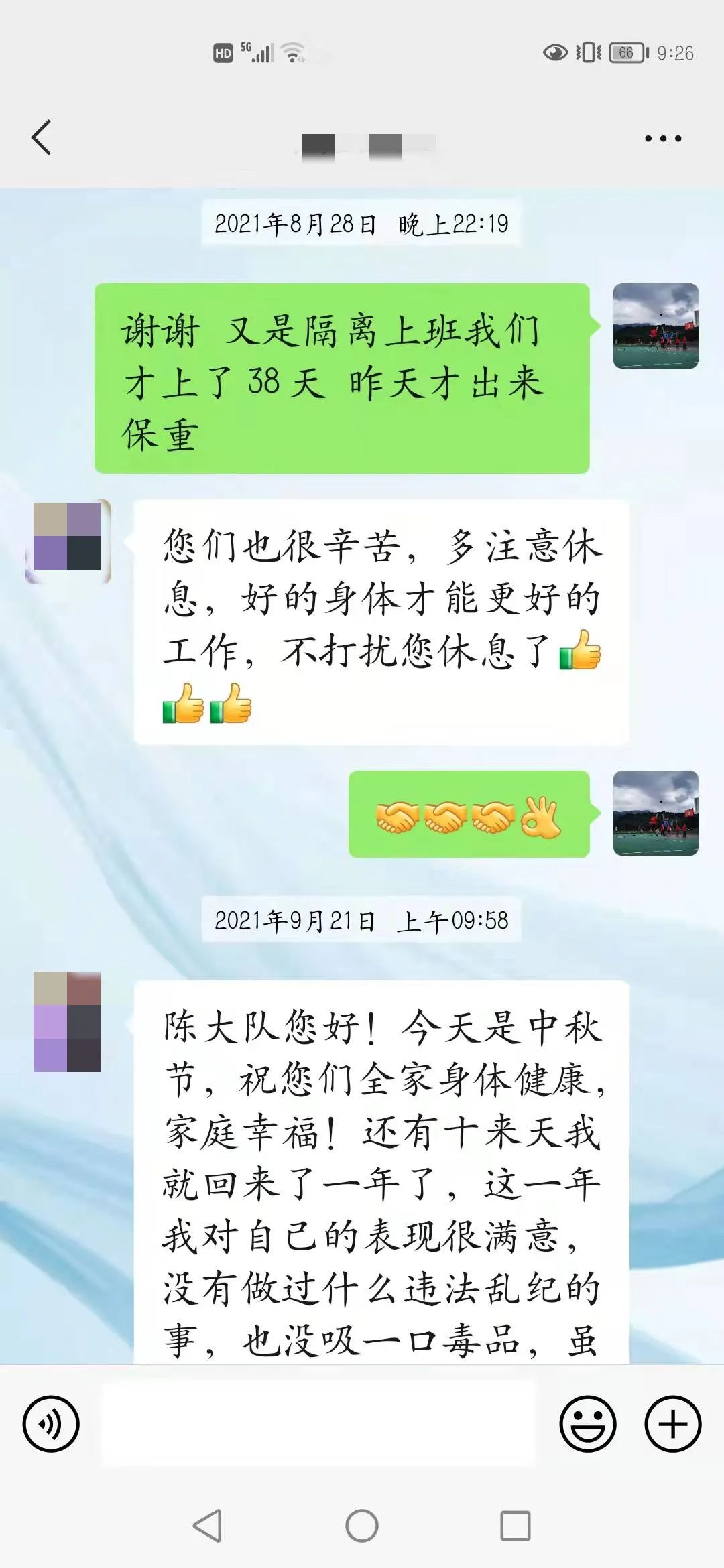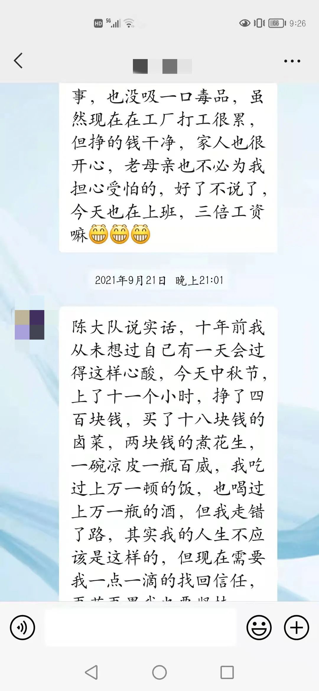 不好意思陈大队,昨晚上的夜班。保持操守是我2022年最大的目标,我一定要坚持下去的。这一年多,我更(原文“跟”)努力在改变自己,也得到了很多人的认可。今年又不回家,一是因为疫情,二是因为很多老一批吸毒的出来了,既然选择了不走回头路,那我就要与他们隔绝,其实我很想回家和家人一起团年,我已经十年没有和家人一起过年了,但为了能像现在一样挺起胸膛做人,也为了家人们不再为我担心受怕,我这两三年还是不与那(原文“哪”)些人有接触的为好,何况现在我在某公司的某车间担任一个组的组长,所以我不想打碎这来之不易的宁静生活,等我回家以后,我一定会亲自到楠木寺赖感谢您及内江所的所有警官,是在您们的帮助下,我才获得了新生,由衷的祝愿内江所所有的警官2022年工作顺利,身体健康,家庭幸福!谢谢您们!