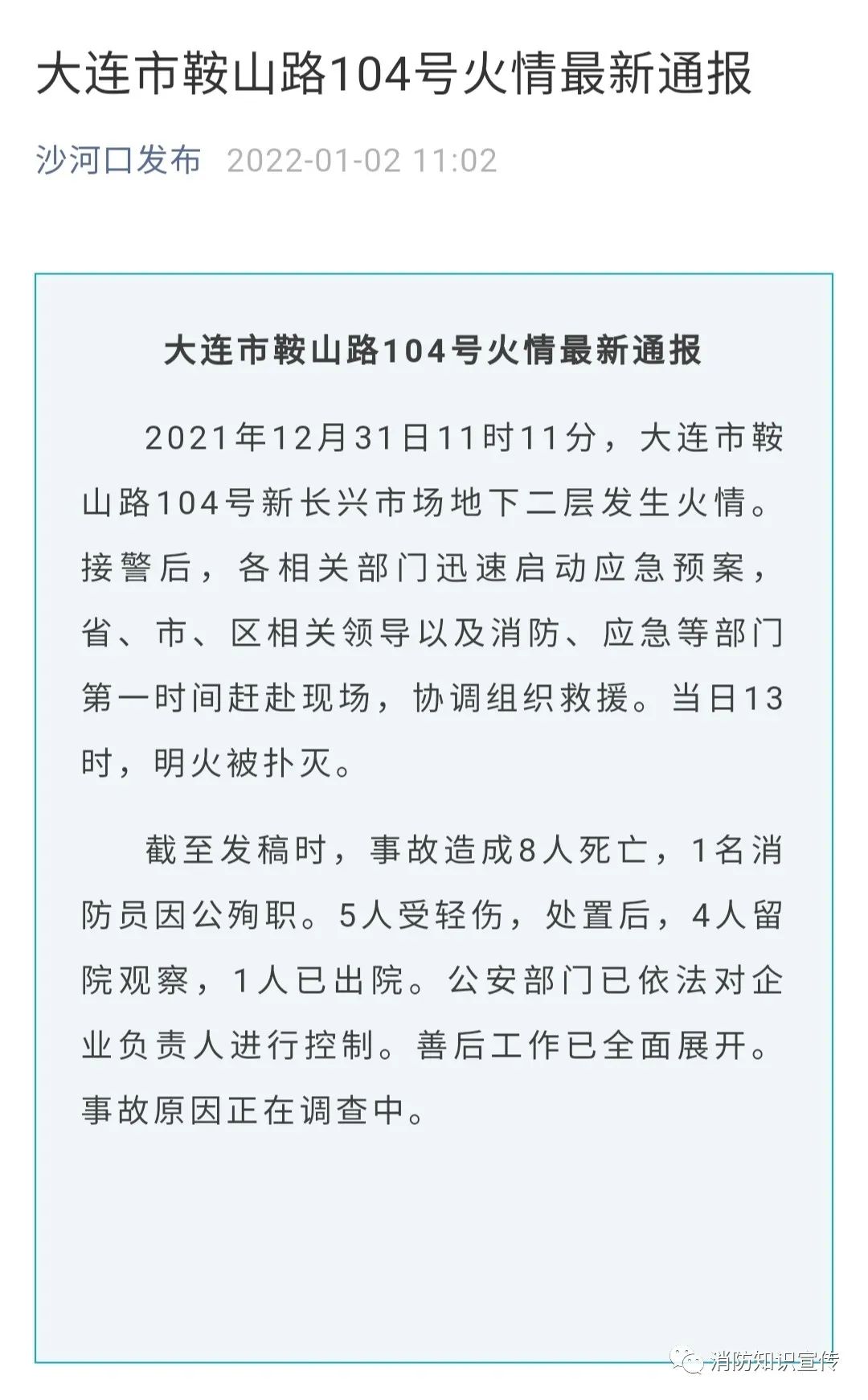 微信公众号“沙河口发布”通报:2021年12月31日11时11分,大连市鞍山路104号新长兴市场地下二层发生火情,事故造成8人死亡,1名消防员因公殉职。5人受轻伤,处置后,4人留院观察,1人已出院。公安部门已依法对企业负责人进行控制,善后工作已全面展开,事故原因正在调查中。