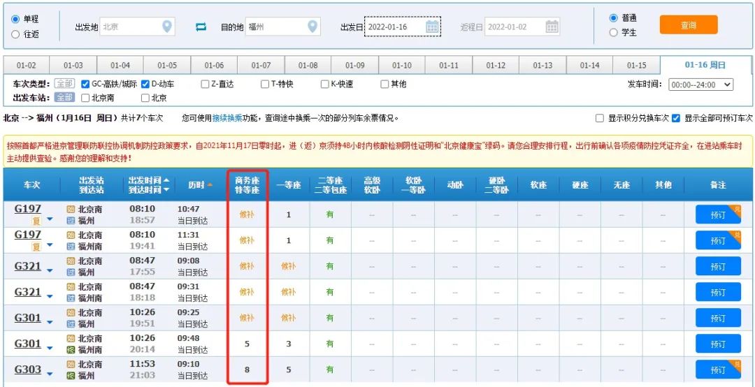 以1月16日从北京出发为例,截至1月2日21时,北京至天津、成都、福州、昆明、南京等地的商务特等座余票所剩无几。例如北京-天津共204个车次有商务特等座,因列车运行图调整有11个车次暂停发售,余下193个车次中仅18个车次商务特等座还有余票;北京-昆明有1个车次可预订车票,但商务特等座已无余票,目前只能候补;北京-福州有7个车次可预订车票,但仅2个车次的商务特等座还有余票;北京-南京可预订车票的42个车次中,也仅有16个车次商务特等座还有余票。