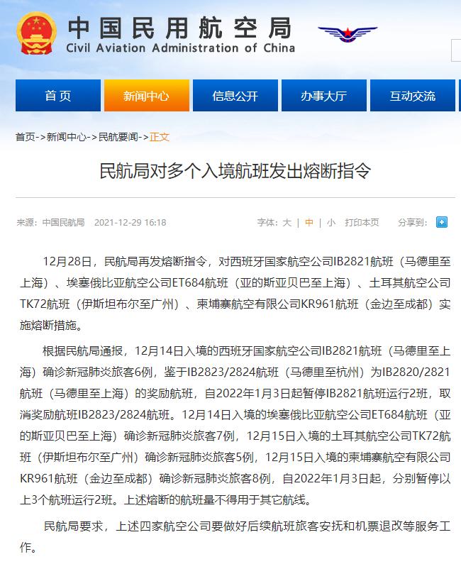 根据民航局通报,12月14日入境的西班牙国家航空公司IB2821航班(马德里至上海)确诊新冠肺炎旅客6例,鉴于IB2823/2824航班(马德里至杭州)为IB2820/2821航班(马德里至上海)的奖励航班,自2022年1月3日起暂停IB2821航班运行2班,取消奖励航班IB2823/2824航班。12月14日入境的埃塞俄比亚航空公司ET684航班(亚的斯亚贝巴至上海)确诊新冠肺炎旅客7例,12月15日入境的土耳其航空公司TK72航班(伊斯坦布尔至广州)确诊新冠肺炎旅客5例,12月15日入境的柬埔寨航空有限公司KR961航班(金边至成都)确诊新冠肺炎旅客8例,自2022年1月3日起,分别暂停以上3个航班运行2班。上述熔断的航班量不得用于其它航线。
