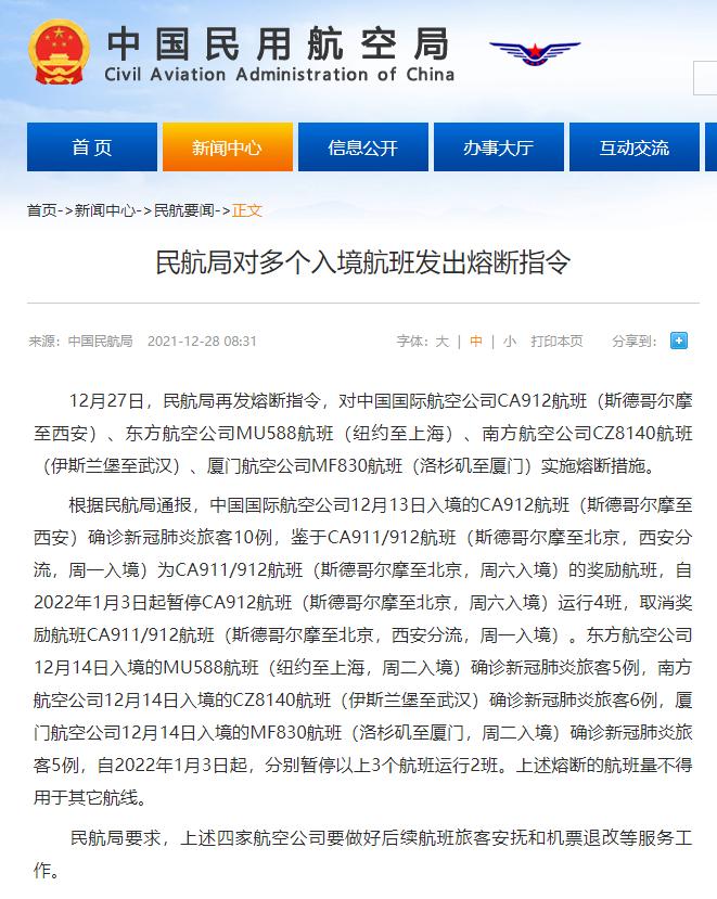 根据民航局通报,中国国际航空公司12月13日入境的CA912航班(斯德哥尔摩至西安)确诊新冠肺炎旅客10例,鉴于CA911/912航班(斯德哥尔摩至北京,西安分流,周一入境)为CA911/912航班(斯德哥尔摩至北京,周六入境)的奖励航班,自2022年1月3日起暂停CA912航班(斯德哥尔摩至北京,周六入境)运行4班,取消奖励航班CA911/912航班(斯德哥尔摩至北京,西安分流,周一入境)。东方航空公司12月14日入境的MU588航班(纽约至上海,周二入境)确诊新冠肺炎旅客5例,南方航空公司12月14日入境的CZ8140航班(伊斯兰堡至武汉)确诊新冠肺炎旅客6例,厦门航空公司12月14日入境的MF830航班(洛杉矶至厦门,周二入境)确诊新冠肺炎旅客5例,自2022年1月3日起,分别暂停以上3个航班运行2班。上述熔断的航班量不得用于其它航线。