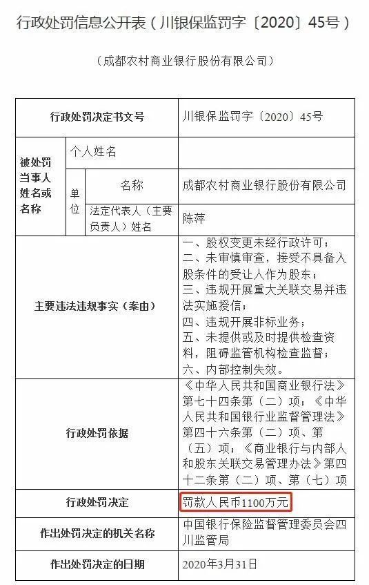 四川银保监局的通报显示,成都农村商业银行股份有限公司因“6宗罪”被银保监会四川监管局罚款人民币1100万元。