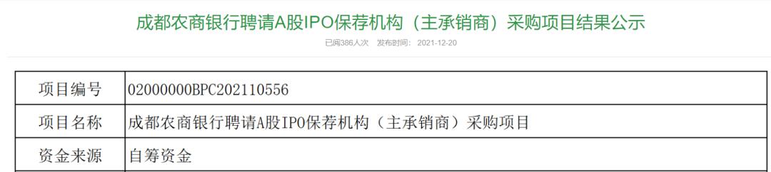 12月20日,成都农商行官网信息显示,该行聘请A股IPO保荐机构(主承销商)采购项目已完成招标, 中信证券成为中选供应商。