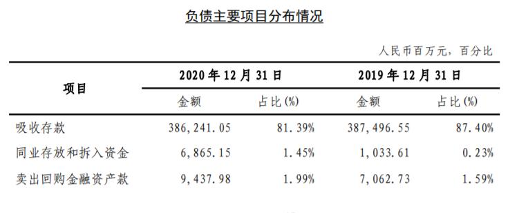 从近年业绩看,安邦保险被接管后,成都农商行的经营受到了一定影响。2018-2020年,成都农商行负债合计分别为5840.06亿元、4433.56亿元、4745.41亿元,其中,吸收存款金额分别为4210.01亿元、3874.97亿元和3862.41亿元,呈逐年下降趋势。