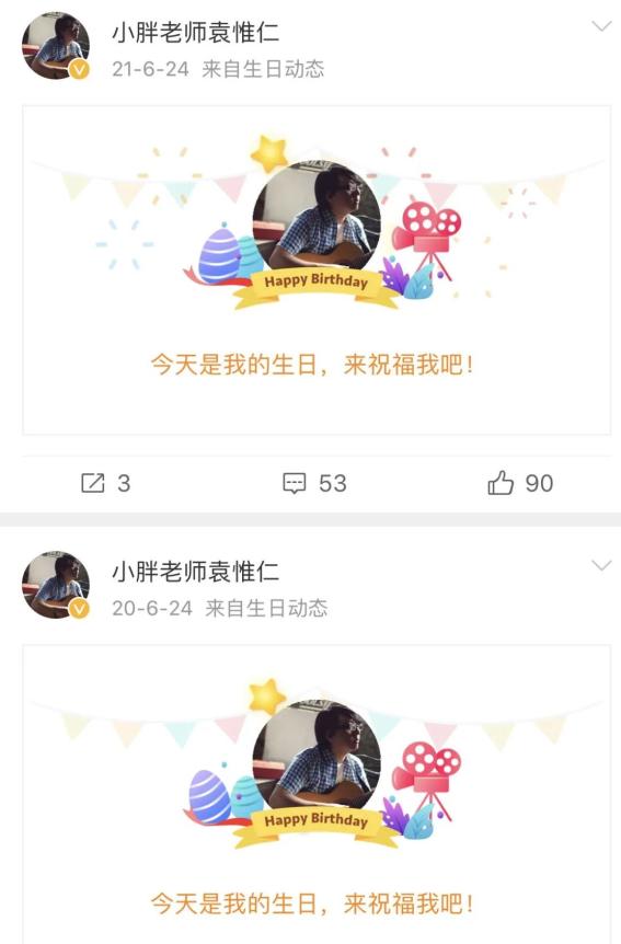 袁惟仁的微博这三年来没有更新过,从2019年到2021年,每年的6月24日他生日这天系统自动发布生日动态,邀请好友祝他生日快乐。不少网友都在动态下发表评论,表示不见袁惟仁更新微博,也一直没有他的消息。
