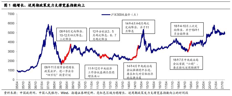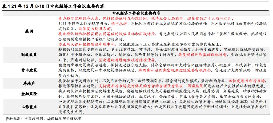 “稳增长”信号明确,后续政策力度有望不断加强。目前经济下行压力加大基本已经成为共识,政策拐点也出现了,但是部分投资者仍然担心后续政策力度不够。12月8日至10日的中央经济工作会议提出我国经济发展面临需求收缩、供给冲击、预期转弱三重压力。经济下行压力加大背景下,“稳”是2021年中央经济工作会议最为突出的关键词,会议新闻稿中出现了25个“稳”字,提出2022年经济工作要“稳字当头”、“稳中求进”。2021年下半年以来宏观政策转向宽松的基调在本次中央经济工作会议得到延续,并且会议重提“逆周期”表述,强调“财政政策和货币政策要协调联动,跨周期和逆周期宏观调控政策要有机结”。在“稳”的大基调下,会议提出各地区各部门要担负起稳定宏观经济的责任,各方面要积极推出有利于经济稳定的政策,政策发力适当靠前。在这样背景下,我们认为货币政策、财政政策和房地产政策均有望放松。货币政策方面,2021年12月20日一年期LPR利率下调5BP,未来还有望进一步放松。财政政策方面,据新华社报道,财政部副部长许宏才12月16日在国务院政策例行吹风会上透露,近期财政部已向各地提前下达了2022年新增专项债务限额1.46万亿元。根据海通宏观团队预测,2022年基建投资增速将达到6%,其中投向广义新基建的比重或提升到18%左右(过去两年均在16%左右)。房地产政策方面,我们预计房地产政策端会渐进式进行调整,减小房地产市场的下行压力。回顾2008年全球金融危机至今,我国先后共推出四轮稳增长的逆周期政策,包括08/11-09/08、11/12-12/12、14/04-15/01、18/12-19/04,在政策宽松的早期,市场还有所犹疑,但是随着更有力的稳增长政策出台、政策效果逐渐显现的时候,市场均有不错的表现。