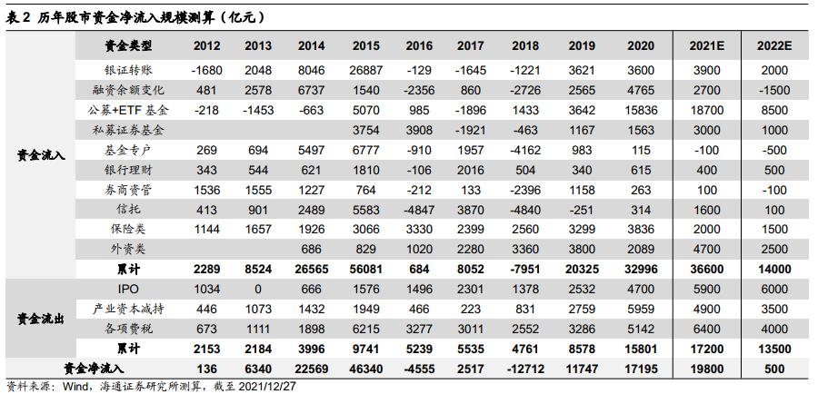 资产配置向权益迁移的长期趋势不变,22年股市资金供求偏平衡。最近三年以来资金持续流入股市,大家已经慢慢习惯了资金从房市向股市迁移,那么明年这种迁移趋势会继续吗?到底有多少资金流入股市呢?这也是大家关心的一个重要话题。在《股市资金供求偏平衡——2022年A股展望系列6-20211231》中,我们提到从长期维度看过去长久以来我国居民的资产配置结构明显重房产轻权益。对比各国居民的资产配置情况,2019年我国居民的权益类(股票、基金等)资产配置比例仅为2%,远低于美国的34%、德国的12%、日本的9%。长期看,我国居民资产配置有望趋势性地从房市转移至股市,核心原因是:一是我国主导产业正从过去的以地产为主转向以科技服务业为主,二是我国人口平均年龄从2000年的31岁升至2020年的38.8岁,居民对地产的刚需配置力度将趋势性下降。但是,短期而言,资金入市节奏与市场行情有关,历史经验显示牛市资金净流入,熊市资金净流出,震荡市紧平衡。对于22年的A股,我们认为首先岁末年初的跨年行情值得期待,但从全年的视角来看,A股在经历19-21年三年上涨后或将在22年迎来阶段性的休整,背后是通胀高位和盈利周期性回落的双重扰动。从而,我们认为2022年的资金面可以参考A股历史上的震荡行情,我们预计22年全年流入幅度相较21年或将大幅放缓,整体上资金流入流出项偏平衡,具体测算数据如下。