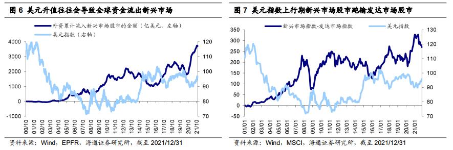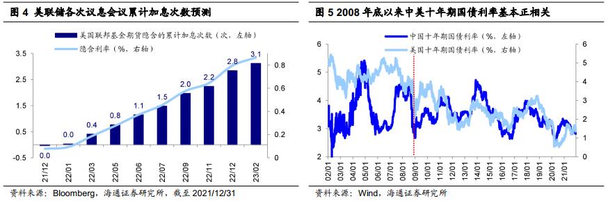 美联储有可能22Q2开始加息,届时中美国债利率有上行压力。目前市场上有投资者对2022年美联储加息会如何影响A股较为关注,我们可以借鉴历史来进行分析。首先关于美联储加息的时点,2021年12月美联储议息会议决定加快Taper,幅度是之前的两倍,按此推算2022年3月将结束Taper,同时美联储点阵图显示2022年预计加息三次。根据Bloomberg数据,目前市场预期今年5月之后美联储加息概率较大,我们认为二季度就需要警惕美联储加息。根据IMF预测,2022年全球GDP同比增速有望达4.9%,其中美国将达5.2%,全球经济复苏将推动国际定价的大宗商品价格上行,进而推升全球通胀预期,届时美联储可能会收紧货币政策,这将可能对A股造成冲击。历史规律显示,美联储加息初期A股往往会下跌,这是因为随着美联储开始加息,美国十年期国债利率中枢大概率上移,在全球经济同步性提升的背景下,我国国债利率也难以下行,从而制约A股估值。此外,美联储加息往往也会推升美元,进而导致全球资金流出新兴市场,新兴市场股市跑输发达市场股市。