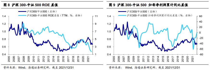 22年价值、大盘略占优,沪深300强于中证500。2021年从指数层面看小市值占优,中证500表现好于沪深300,那么2022年市场哪一类风格会占优?我们在《风格:大盘与价值略优——2022年A股展望系列1-20211210》中分析过,风格变迁的背后是盈利相对趋势的变化。从历史上看,沪深300/中证500与沪深300-中证500 ROE差值、归母净利润累计同比差值走势较为一致,2021年中证500之所以占优也是因为沪深300-中证500 ROE差值下滑,即中证500相对盈利更强。此外,市场环境也是影响风格的重要因素,牛市阶段通常是成长与小盘占优,熊市阶段通常是价值与大盘占优,震荡市风格特征不明显。2021年依然处于牛市中,所以小盘风格表现更好。展望2022年,从盈利看,我们预计全年沪深300归母净利润同比为7%,中证500为2%;从市场环境看,我们认为A股在通胀高位和盈利周期性回落的双重扰动下或将迎来阶段性的修整。因此,在业绩相对占优且市场可能调整的情况下,2022年沪深300有望略优于中证500。