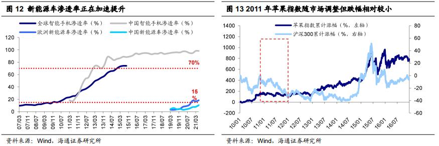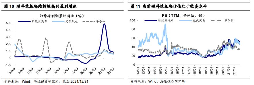 22年利润增速绝对值高但相比21年回落,估值消化契机是市场调整。2021年新能源车、光伏风电和半导体等硬科技板块表现亮眼,以公募基金为代表的机构配置比例较高,投资者关心2022年硬科技板块涨幅是否能够依然居前。对此我们从盈利和估值的匹配度来分析,首先硬科技板块的盈利增速确实要高于全A,根据Wind一致预期,21Q3/21E/22E新能源车产业链的归母净利润累计同比为83.1%/105.0%/ 42.5%,光伏风电产业链为54.1%/69.1%/35.5%,半导体产业链为67.5%/65.7%/28.5%,明显高于全部A股的25%/30%/5%。但是从趋势上看,硬科技板块的盈利增速在下滑,同时估值已经处于历史较高水平,截至2021/12/31新能源车产业链PE(TTM,下同)/13年以来自下而上分位数为48.9倍/92.8%,光伏风电产业链为48.5倍/70.3%,半导体产业链为35.7倍/65.2%。2022年硬科技板块的表现依赖于市场环境的变化,对此我们在《借鉴智能手机看新能源车产业演变-20210906》中指出过,2021年新能源车产业链类似2010年苹果产业链,高景气支撑高估值,但2011年苹果指数盈利有所下滑,随着市场整体调整苹果指数也同步消化估值。因此,我们认为新能源车等硬科技板块也会经历估值消化的阶段,但需要等市场环境改变,今年一季度市场有望延续上升趋势,未来市场如果出现调整则需要警惕这种情况的发生。
