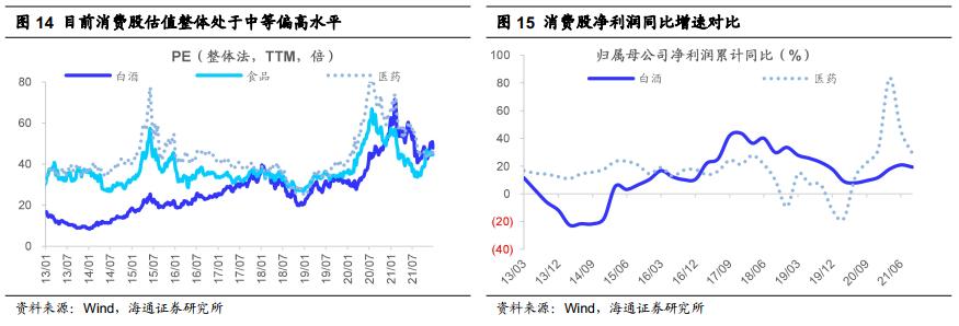 当前估值中等偏高、业绩增速回落,大机会还需要等待。消费股曾经是公募基金的心头好,是2019年和2020年配置比例最高的板块,然而最近一年大消费走势较弱,近期以白酒为代表的消费股迎来一波反弹,那么消费股是否出现了配置价值呢?整体上,我们认为目前消费股估值处于历史中等偏高水平,同时2022年业绩增速偏低,整体机会还需要耐心等待。从估值看,2021年初白酒PE(TTM,整体法,下同)最高达到71倍,此后估值不断下移,截止2021/12/31,白酒PE为47.9倍,处于2005年以来估值从低到高的85%分位,2021年初食品PE最高达到67倍,此后估值逐步回落,目前食品PE为44.6倍,处于2005年以来估值从低到高的72%分位,2021年初医药PE最高达到85倍,此后估值不断回调,目前医药PE为46.2倍,处于2005年以来估值从低到高的69%分位,整体上,消费股估值处于历史中等偏高水平。从业绩看,历史经验显示国内经济企稳回升增长后,消费数据才会好转,前文我们提到2022年经济下行压力较大,所以消费股短期业绩难见较大改善。具体而言:21Q3白酒净利润累计同比为19%,行业分析师预测2022年净利同比增速为15%,医药为29%、5%。可见,目前大消费板块估值并不便宜,结合2022年业绩增速偏低,我们认为全年消费股行情以震荡为主。