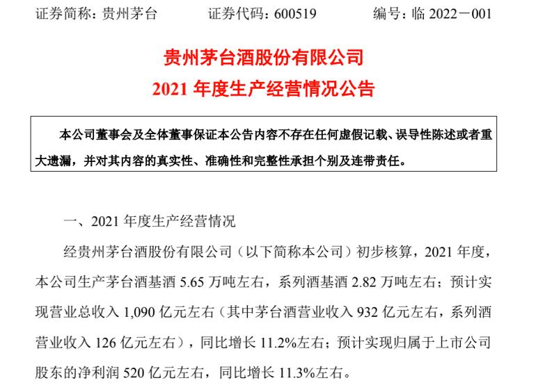 近日,贵州茅台发布2021年度生产经营情况公告,公告显示,2020年度,公司生产茅台酒基酒5.65万吨左右,系列基酒2.82万吨左右;预计实现营业收入1090亿元左右(其中茅台酒营收932亿元左右,系列酒营收入126亿元左右),同比增长11.2%左右;预计实现归属于上市公司股东的净利润520亿元左右,同比增长11.3%左右。